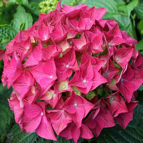 Гортензия Альпенглюхен (Hydrangea macrophylla Alpenglühen) – это классический, проверенный временем сорт крупнолистной гортензии, знаменитый своим насыщенным и устойчивым цветом. Название сорта, переводимое как «Альпийское сияние», идеально описывает его яркую, стабильную окраску. Этот компактный и прямостоячий кустарник формирует плотную крону, достигая высоты и ширины около 1–1,5 метра. Листва у гортензии Альпенглюхен крупная, глянцевая, темно-зеленого цвета, что создает идеальный фон для ее впечатляющих шаровидных соцветий, которые в диаметре могут достигать 15–20 см.
