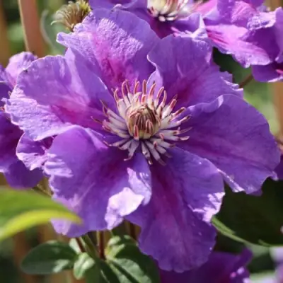 Цветы клематиса Ашва – это истинное великолепие садового мира. Каждый цветок имеет крупный размер (5-8 см) и округлую форму, а количество лепестков доходит до шести. Лепестки удивляют своей почти круглой формой с изогнутыми краями, создавая эффект изящности и благородства. Цветовая гамма включает пурпурно-фиолетовые оттенки с выразительной красной полоской посередине, которая вносит нотку оригинальности. Клематис Ашва также отличается сладким и интенсивным ароматом.