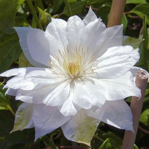 Этот клематис отличается крупными махровыми белыми цветками диаметром 10–13 см, раскрывающимися на побегах прошлого и текущего года. Цветение начинается в позднюю весну и продолжается до начала лета, а при правильном клематис уходе возможно повторное цветение в конце лета. Обильное цветение покрывает лиану плотным белым ковром, создавая выразительный декоративный эффект на шпалере, арке или фасаде дома.