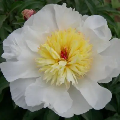 Внешние лепестки крупные, прекрасно оттеняются белым цветом, а иногда легким розовым оттенком, создавая впечатление нежности и изящества. Внутренние лепестки узкие и длинные, светло-желтые, центр малиновый – такое сочетание цветов придает саженцам пиона травянистого Золотой амулет особый шарм и привлекательность.
