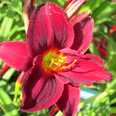 Цветки данного лилейника имеют крупный размер с диаметром более 10 см, что делает их привлекательными для глаз. Основная окраска цветка – глубокий красный цвет, который гармонично сочетается с желтым горлом, создавая эффектный двухцветный шарм. Цветы излучают слабый аромат.