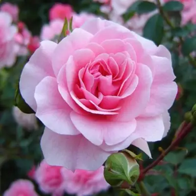 Компактный кустарник высотой до 120 см с округлой широкой кроной формирует плотные соцветия из 10–20 аккуратных розовых бутонов. Цветки среднего размера (6–8 см), махровые, с нежным розовым оттенком, который на солнце светлеет до почти кремового. Аромат мягкий, еле уловимый — не перебивает другие ароматы в саду, но даёт тонкий флёр.