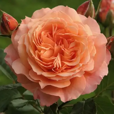 Цветение начинается в июне и идёт волнами до самых холодов. Цветки крупные — до 12 см в диаметре, густомахровые, с 80–90 лепестками. Форма — чашевидная, лепестки закручиваются внутрь, образуя изящную розетку. Цвет — насыщенный абрикосово-персиковый, с едва заметной красноватой подложкой у основания лепестков. Окраска не тускнеет даже на открытом солнце. В соцветиях — по 3–5 цветков, иногда больше. Роза ароматная: запах тёплый, пряный, с оттенками древесины и сухих трав.