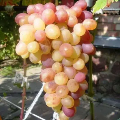 Грозди аккуратные, средней плотности, массой 600–700 г. Ягоды овальные, розовые, весом около 8 г. На солнечных местах окраска становится яркой, что делает урожай особенно декоративным. Мякоть сочная и мясистая, кожица тонкая и почти не ощущается при еде. Вкус гармоничный с выраженным мускатным ароматом, который особенно ценят любители свежего винограда.